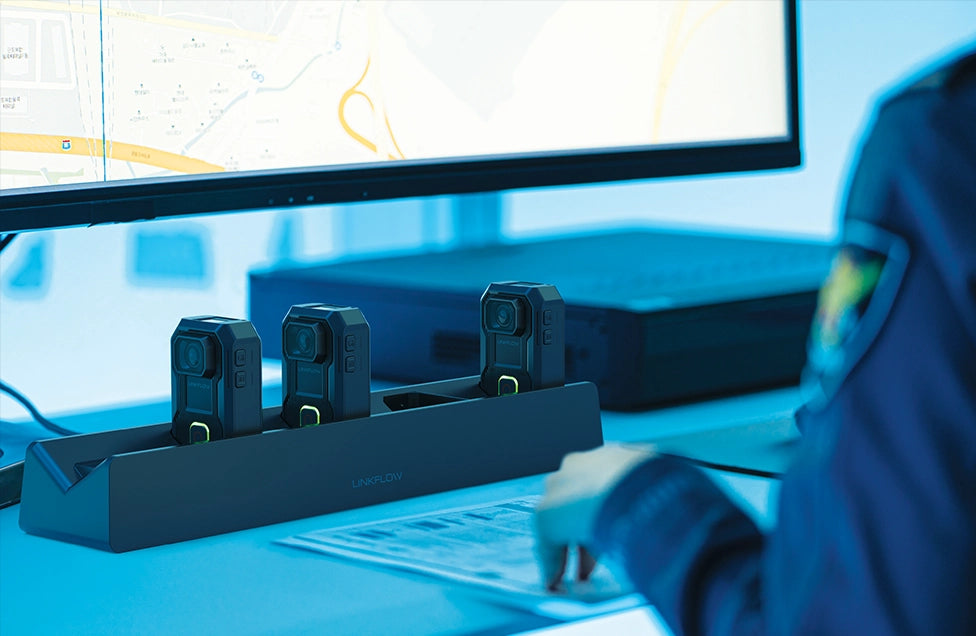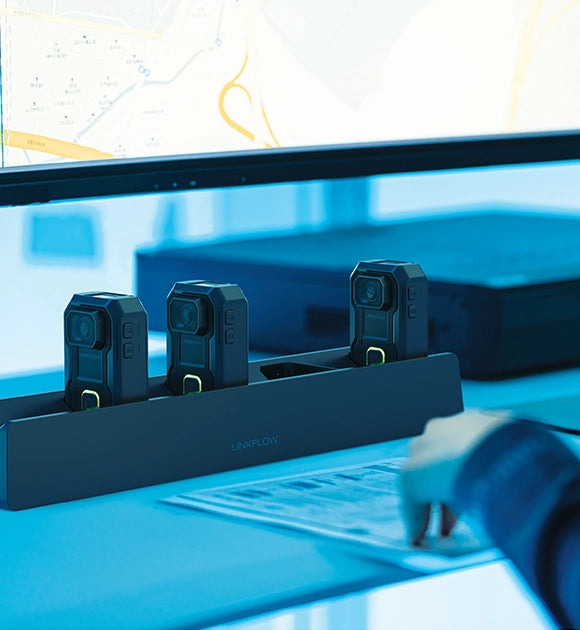 P3000 전용 도킹 크래들을 통해 안전한 데이터 백업과 충전을 진행할 수 있습니다. LINKFLOW 자체 기술을 통해 바디캠과 연동하여 데이터 전송을 안전하게 수행할 수 있으며, 관리자 프로그램을 통해 바디캠에 접속하여 설정을 변경하고 다양한 기능을 지원합니다.